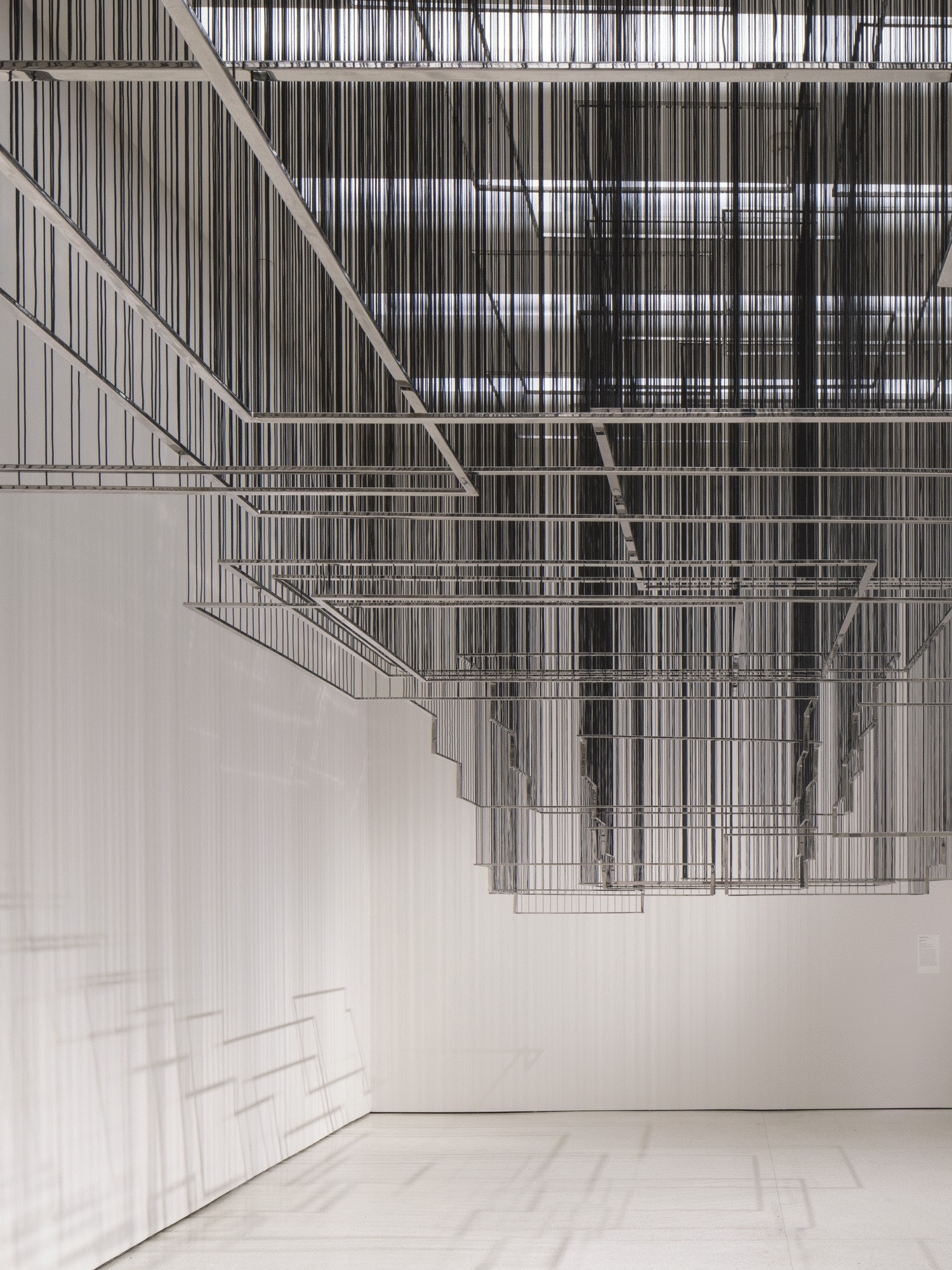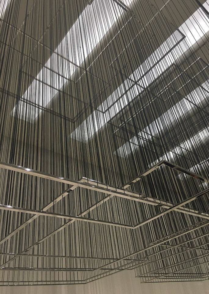 Of mainly African, Arab, or South Asian descent, the peddlers also use their carpets to bundle together their goods in order to flee from the authorities. Nadia Kaabi-Linke’s installation gives expression to the socio-political predicament of the hawkers. In her work, geometric metal forms, derived from stencil outlines of the hawkers’ carpets, are suspended by cascades of hanging thread. Hovering in space like a floating cage, the work takes the shape of a bridge, Il Ponte del Sepolcro in Venice, where the artist spent an eight-day period documenting the activities of the street sellers. With beauty and fragility, the work underlines what is, in effect, a day-to-day sense of confinement experienced by the hawkers as they clandestinely “move” from place to place.