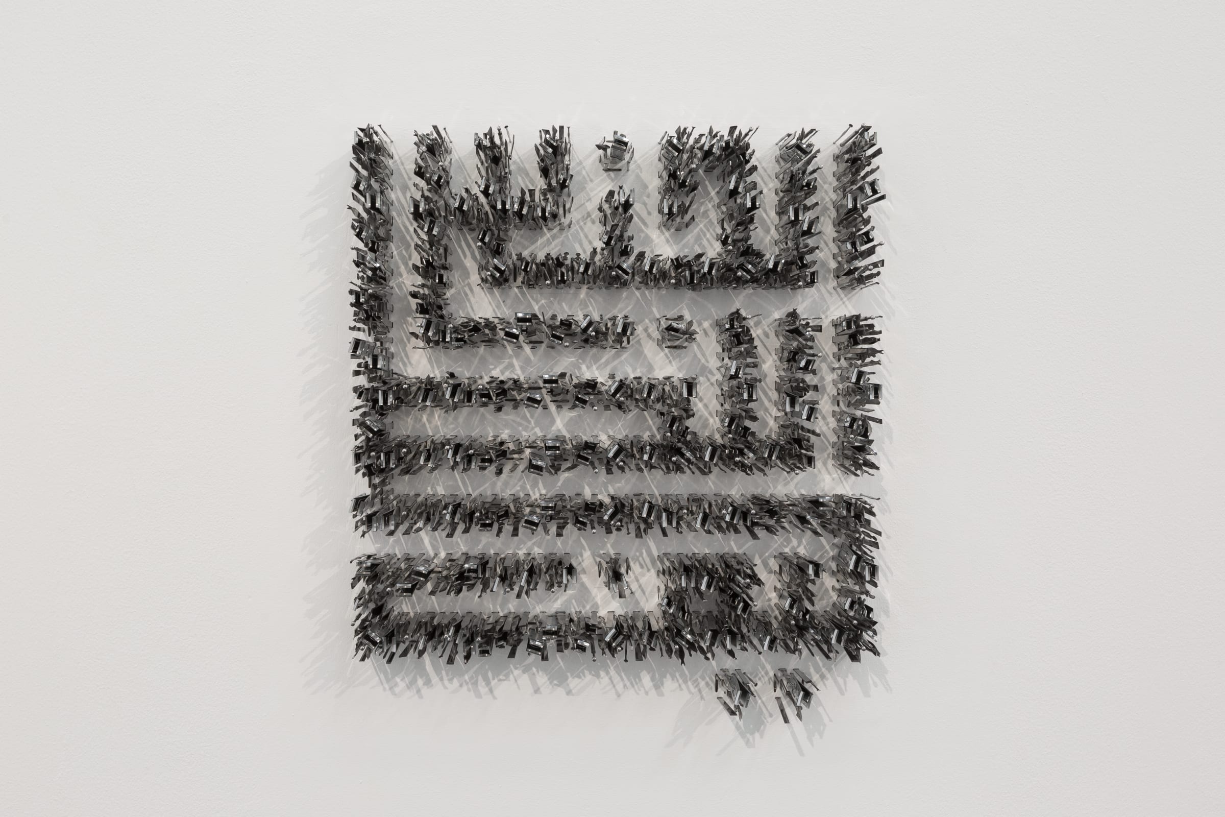 Al Jins Al Latif is a wall sculpture mounted onto or into the wall, created from hundreds of sets of manicure and pedicure instruments. These instruments are arranged as an inscription in square Kufic calligraphy, spelling the Arabic word for “gentle sex” or “kind sex,” one of the expressions for the female gender.
