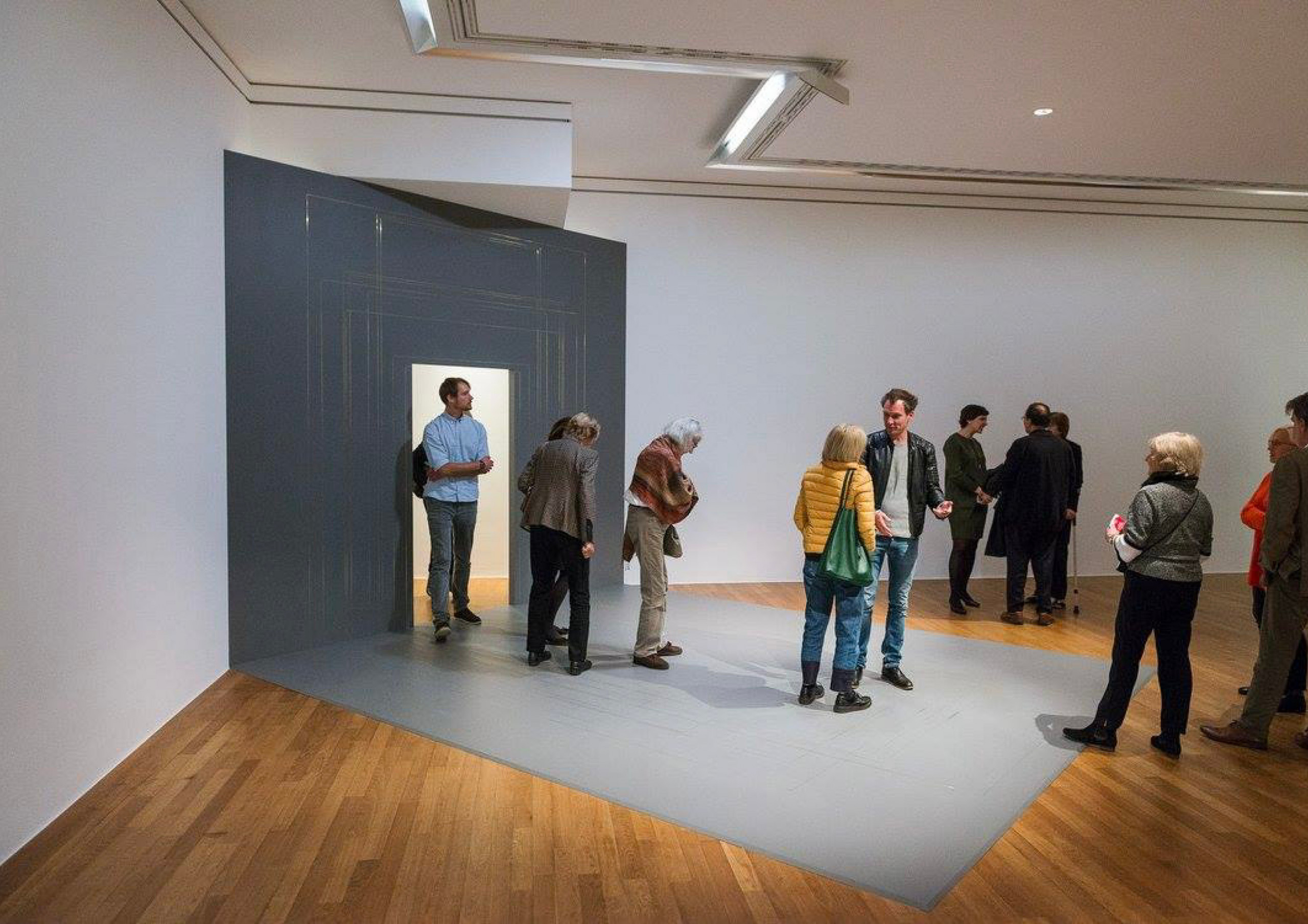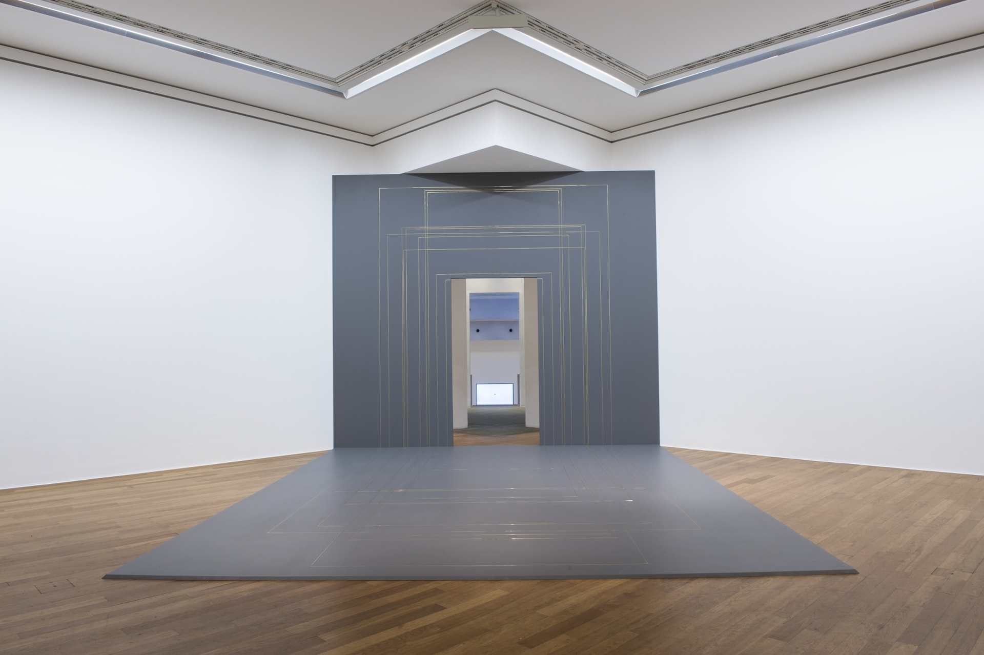 In the series Modulor, Nadia Kaabi-Linke explores the sizes of prison cells in countries around the world. The installation shares some qualities of a drawing as it superimposes the rectangular measurements of the cells’ floor plans to define an overlapping grid on the floor and the gallery wall. From afar, the abstracted shapes appear as beautiful forms, but a closer view reveals the names and geographic locations of the prisons. The work’s title refers to a system of proportions based on an idealized male body developed by the influential modernist architect Le Corbusier, who advocated for its use in designing buildings. Kaabi-Linke’s practice often combines the sparse geometries, materiality, and spatial awareness of minimalism with rigorous research into social, cultural, and political conditions. In Nadia Kaabi-Linke’s work, the research process is as important as the final product. Modulor examines confinement, captivity, and control both physically and metaphorically. The installation raises questions about the design of prison cells and how such spaces are inhabited and experienced. By analyzing the rooms’ ratios and minimum conditions for a person, the installation also draws comparisons to dwellings and the rationalizing effects of architecture. Through subtle but evocative methods, Kaabi-Linke’s works visualize challenging historical and contemporary issues in a refined formal language.