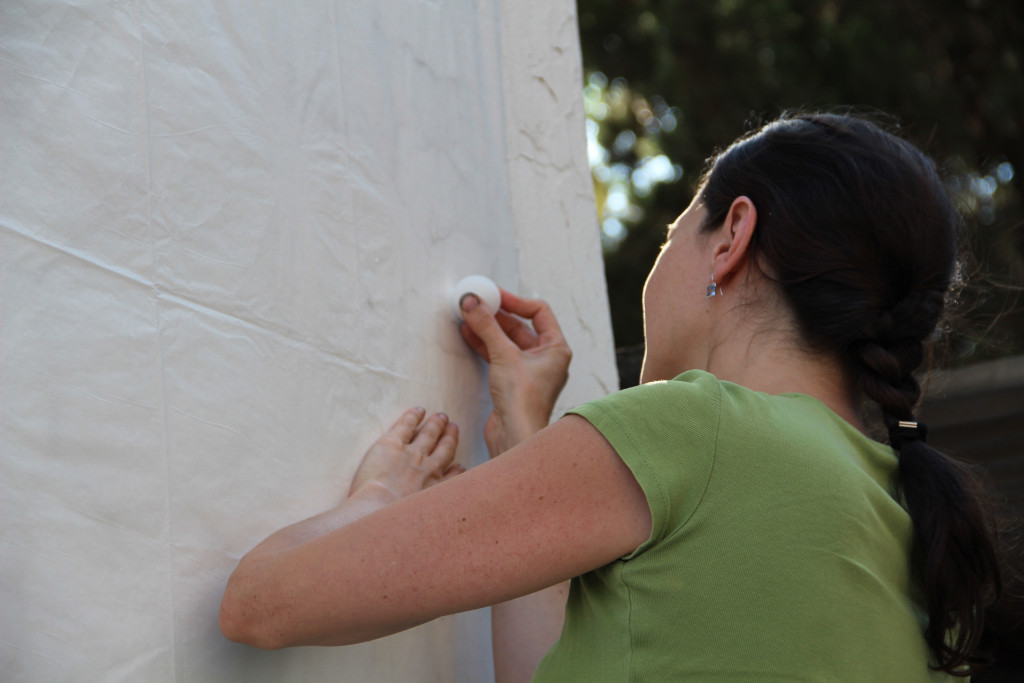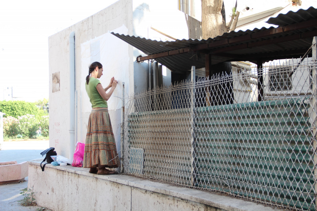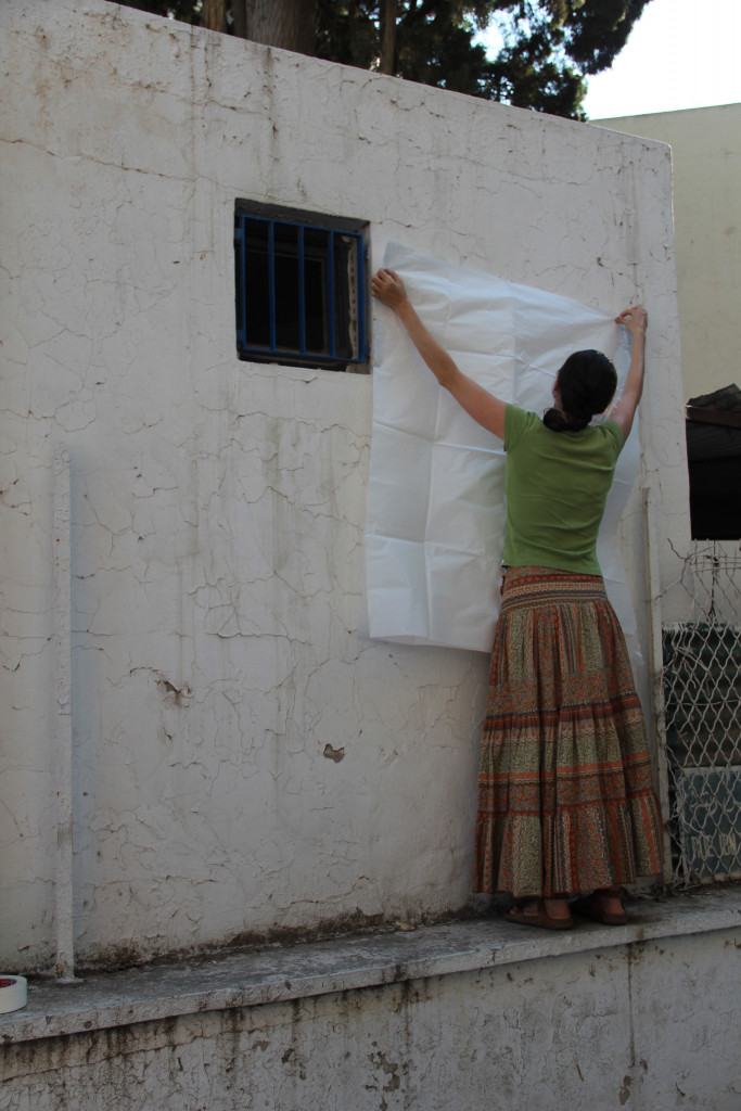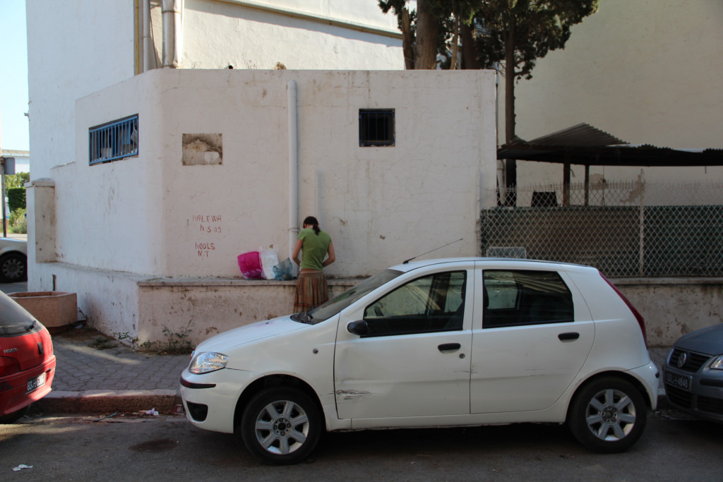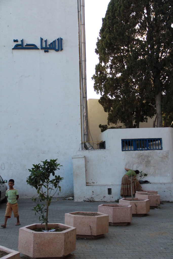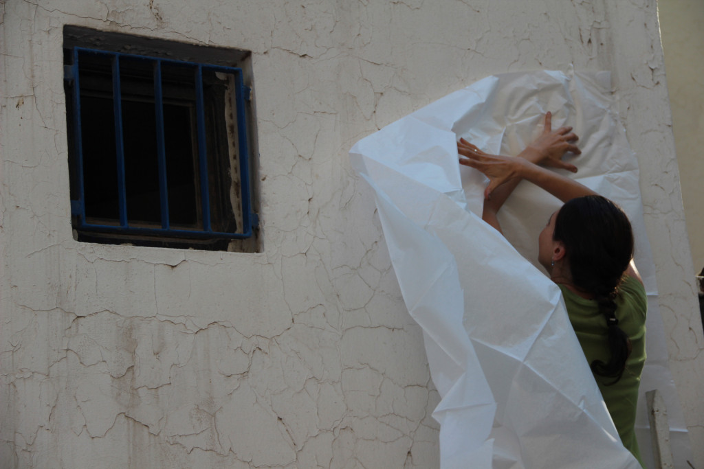 The canvas carries an impression taken from an external wall of the Tunisian Ministry of Tourism. The ministry is located near Habib Bourguiba Avenue, an area in Tunis where most of the protests that led to the fall of Ben Ali’s regime were held. The summer following the revolution saw considerable declines in tourism to Tunisia—a country where tourism is ten percent of the national income. This economic dependence on mass tourism, especially at a time when the country was in most need of financial support, has entrapped those depending on it.
