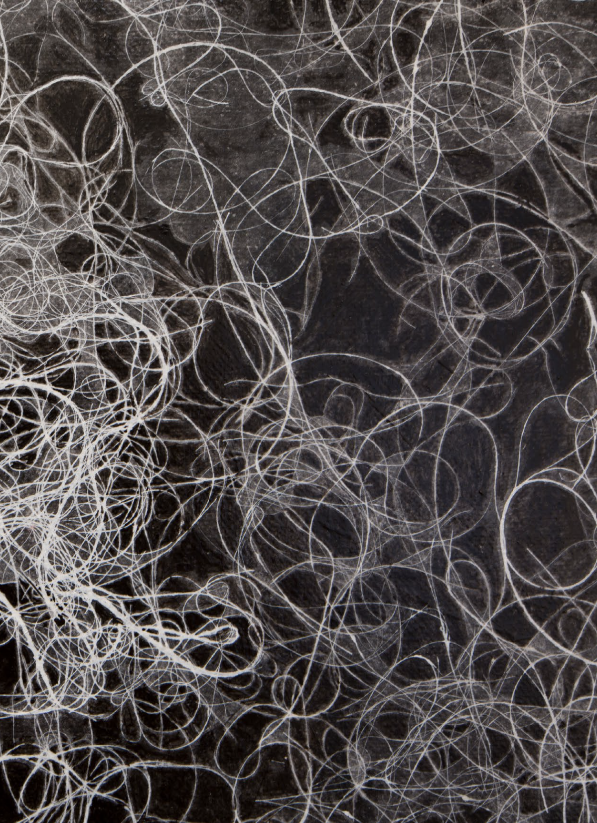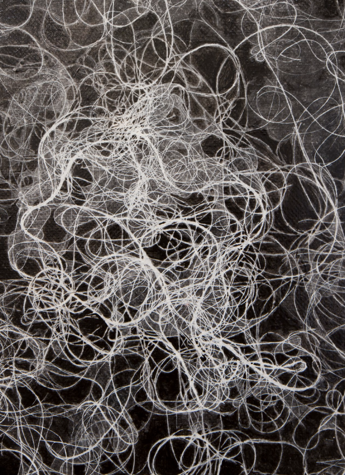 Several of Kaabi-Linke’s past works have used her hair or prints derived from it – female hair carrying a host of associations and ascriptions such as time, age, desire, beauty and elegance – altogether summed up in a rather masculine idea of femininity. On the other hand, Negative of Black Hair on White Ground, a printed monotype with acrylic, uses hair in an abstract painting showing nothing but white-washed imprints of hair neutralised by any kind of narrative while formally referencing the black square of Malevich that was breaking the need for representation.