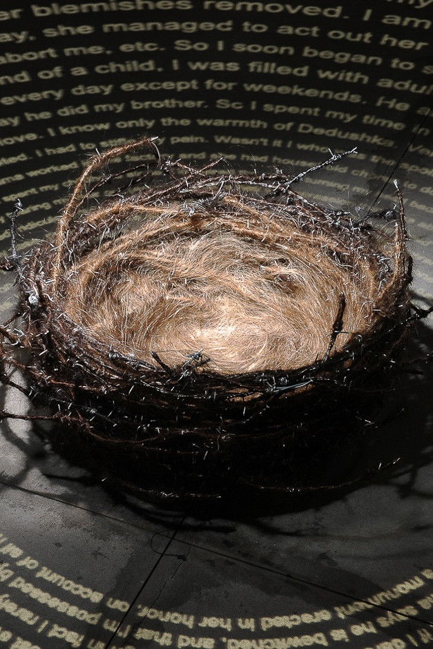 In this work, the motif of the inseparable intertwining of experience and destruction is concretized in various ways. The account of a damaged life is projected onto the floor as a spiral-formed text. Those wishing to read it must move in a circle so that the dizzy feeling generated by the reading doubles. The text’s end enters into a paradoxical object—a hair-nest. The nest, a place of security and warmth, is made of barbed wire matted with hair, thus becoming an allegory of family-hell as a social nucleus. The new life born in such a nest easily perishes within it. That life experiences the world as a state of emergency, an experience that persists throughout its life.